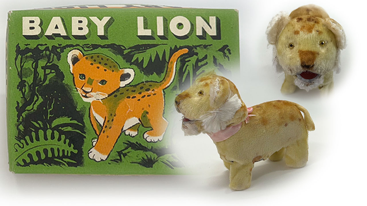ゼンマイ仕掛けのおもちゃで、ピンクのリボンとしっぽがとても可愛い赤ちゃんライオン。