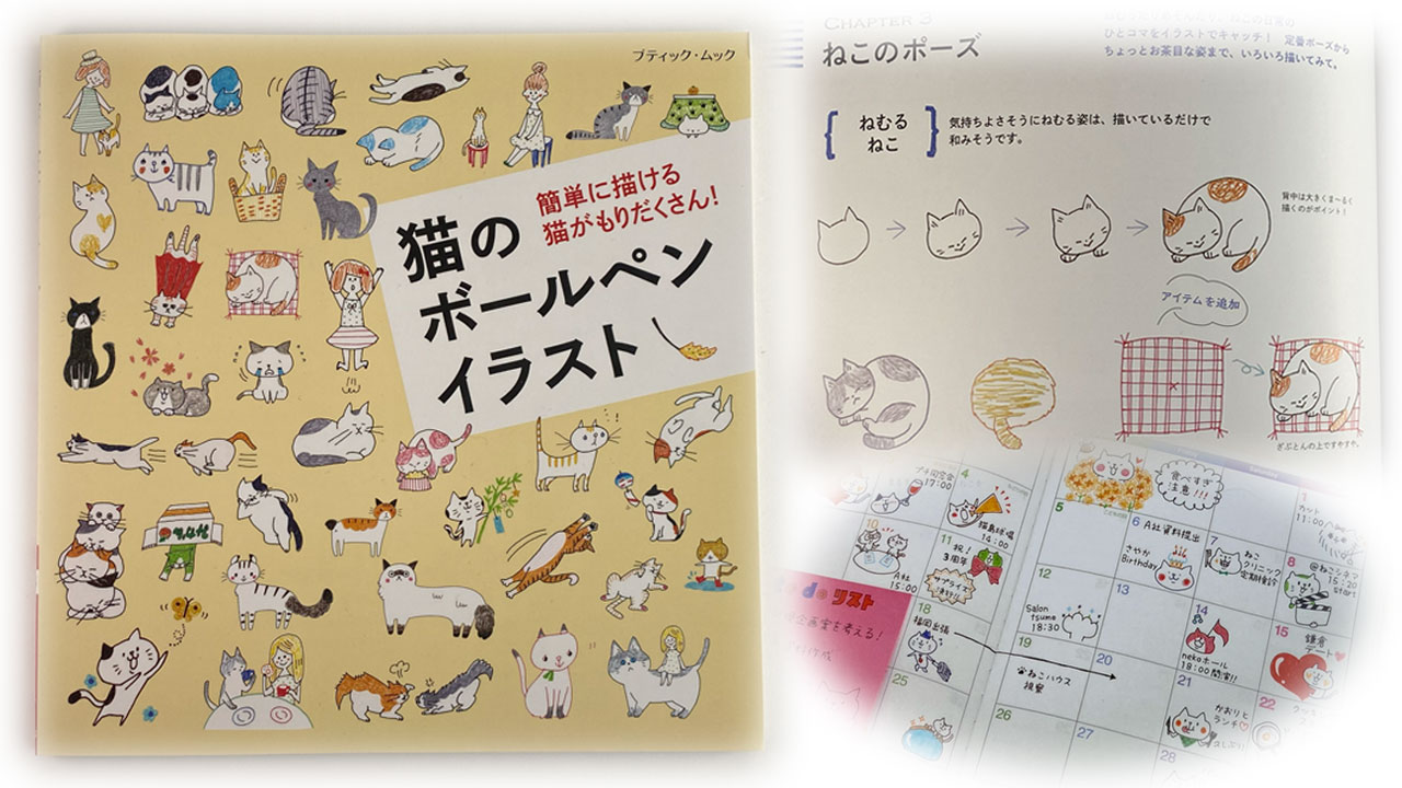 ボールペンの紹介から始まり、猫を含めた様々なイラストを描く方法が掲載されています。人物や植物、食べ物、街の風景など幅広い題材をプロセス付きで解説しており、カードや手帳に応用できる素材集もあります。