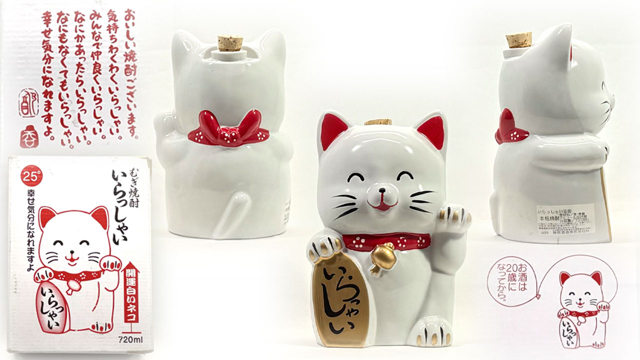 見て見て!!って言いたくなる、招き猫デザインの可愛い麦焼酎ボトル🐱🍶✨
